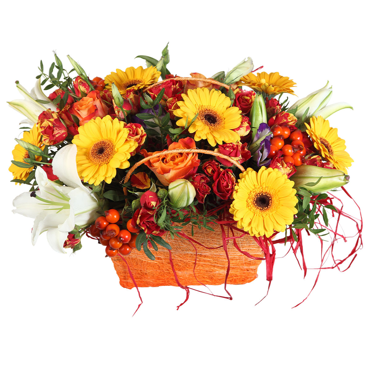 Гербера желтая, роза одноголовая оранжевая, лилия белая, эустома фиолетовая, гиперикум. Упаковка (Корзина, оазис, ящик).
